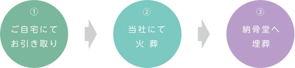 ご自宅にてお引き取りして、当社にて火葬、納骨堂へ埋葬致します。