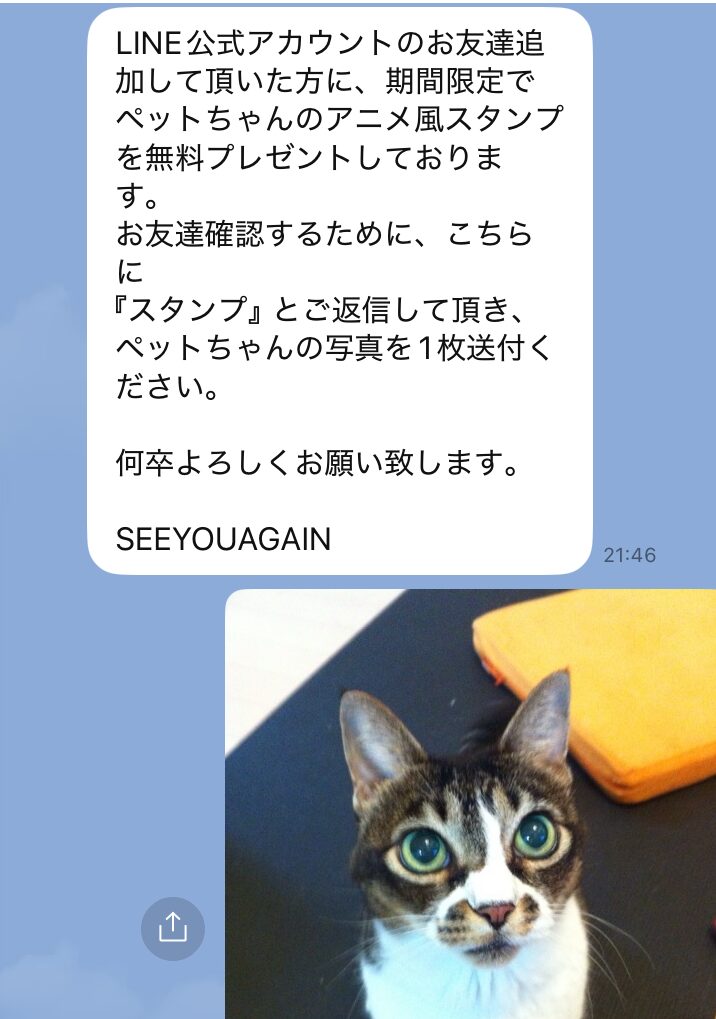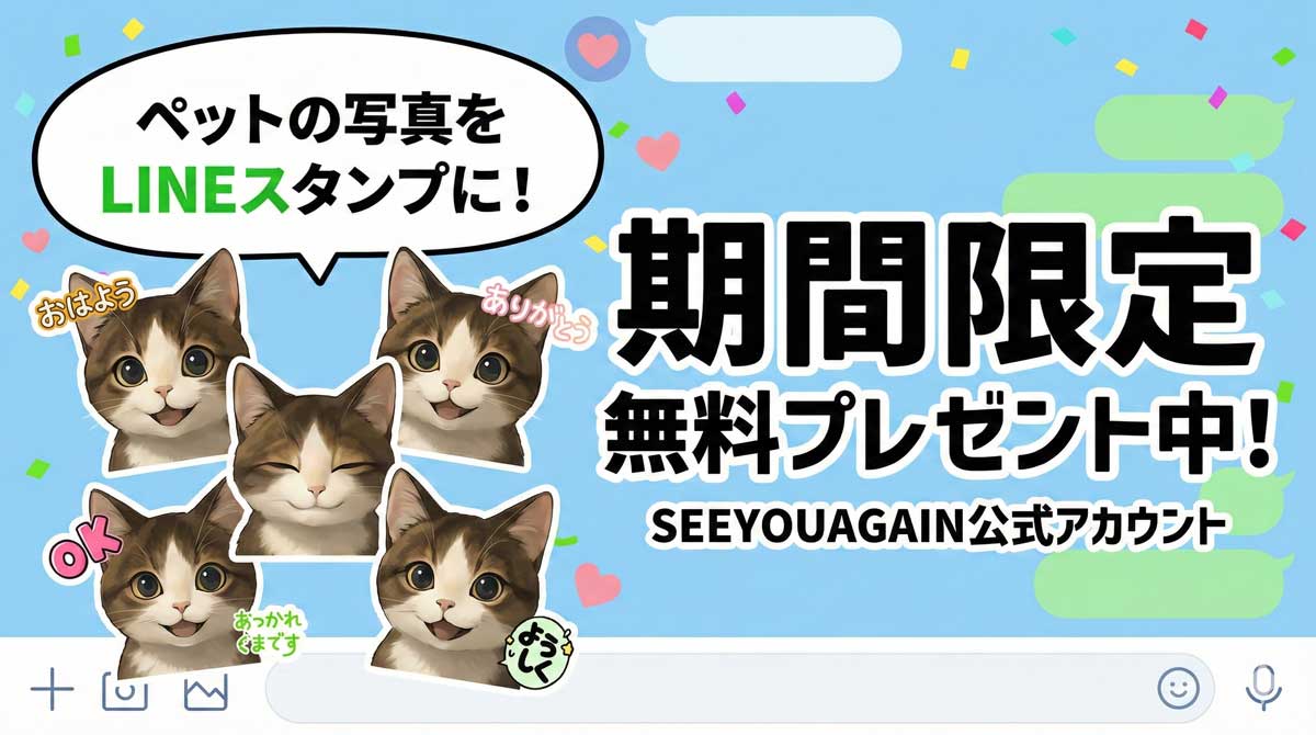 このサービスは、SEE YOU AGAINの公式LINEを友だち追加し、ペットのお写真を1枚送っていただくだけで、オリジナルのLINEスタンプをお作りする期間限定のサービスです。もちろん、スタンプ作成にかかる料金は無料。